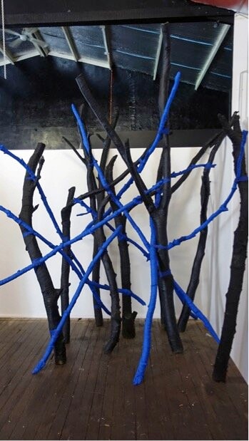 Found branches wrapped in fabric, paint, wire, tape.