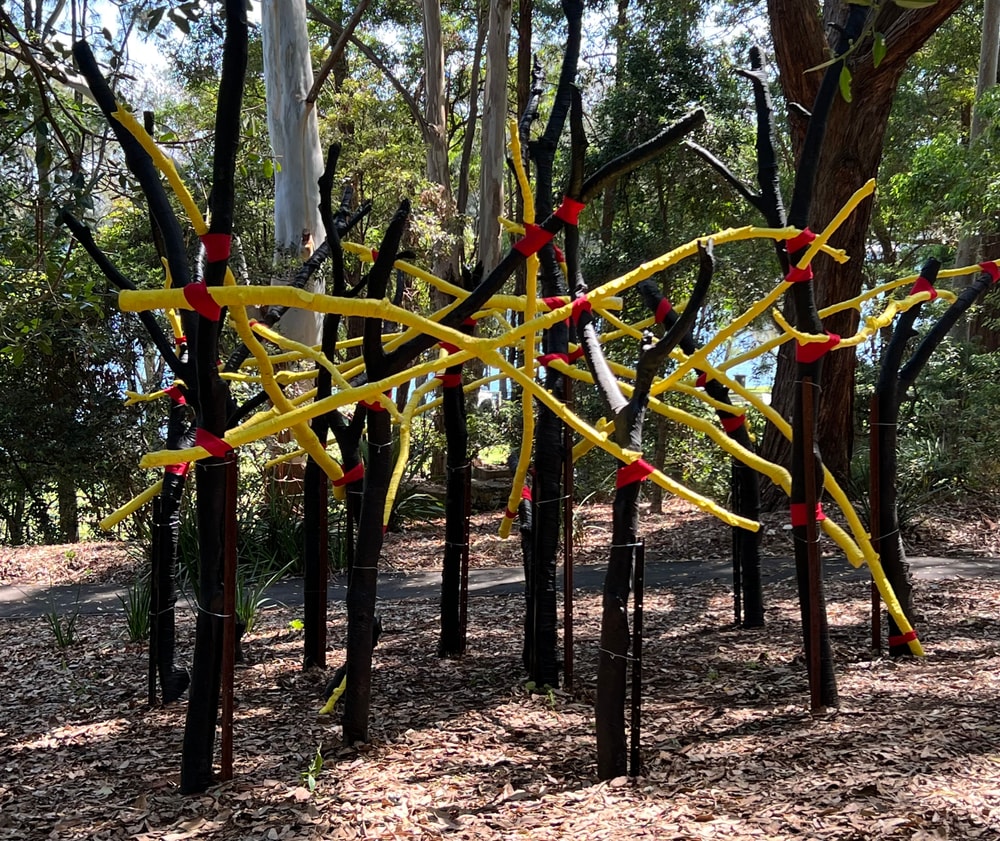 The title refers to the repeated studies, enquiries and reports documenting species collapse, environmental degradation and water stress. Yet for Australian governments, miners and developers, it’s business as usual. Nothing changes. In Mise-en-abyme, Murray and Burgess use yellow saplings to brace a cluster of black and burnt trees in a mutually supporting structure. It conveys the notion that damaged yet capable of regenerating, the natural world depends on changes in human actions to survive.