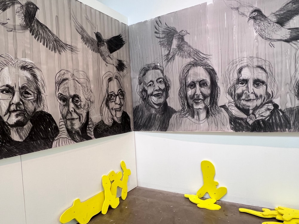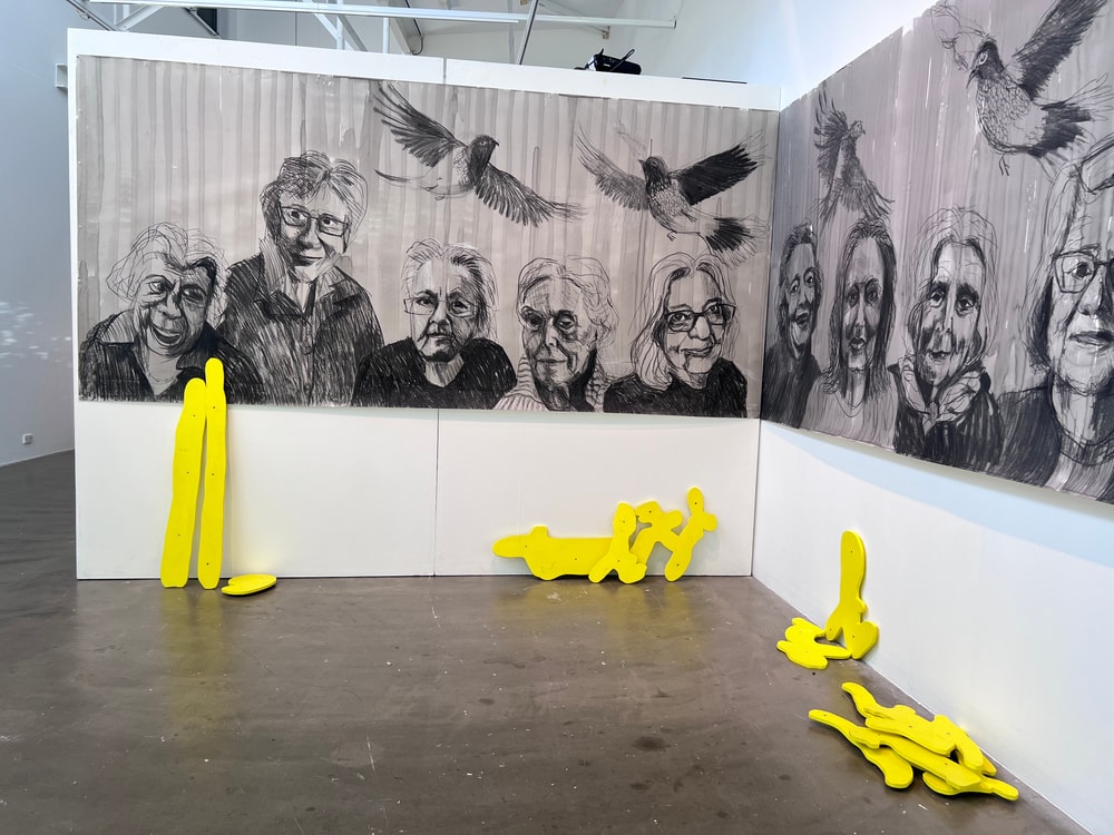 In an installation along two gallery walls, the 18 portraits of SCOOP assert the value, power and presence of women artists late in their lives. They claim back the power of age.