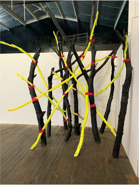 Sculpture at Sawmillers at McMahons Point, 8-17 October 2021 with their work MISE-EN-ABYME (YELLOW). Meaning to mirror or repeat, this work is of a mini forest of dead trees which echoes the more frequent occurrences of natural disasters due to climate change.