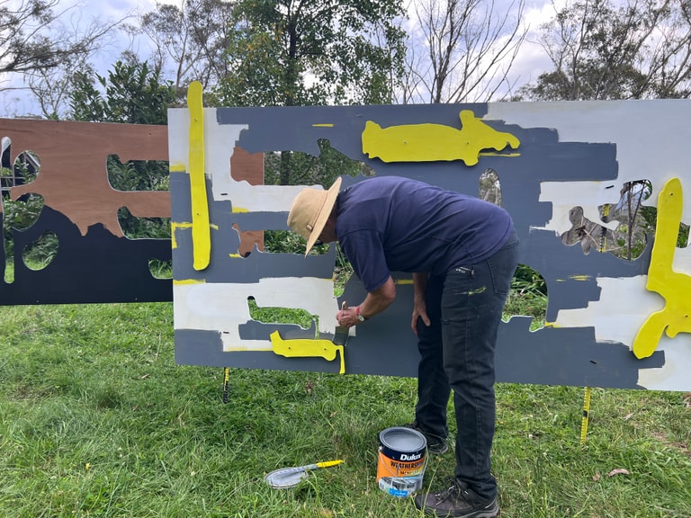 HOLDING…2024, acrylic on external plywood, steel star pickets, approx 5 x 4 m